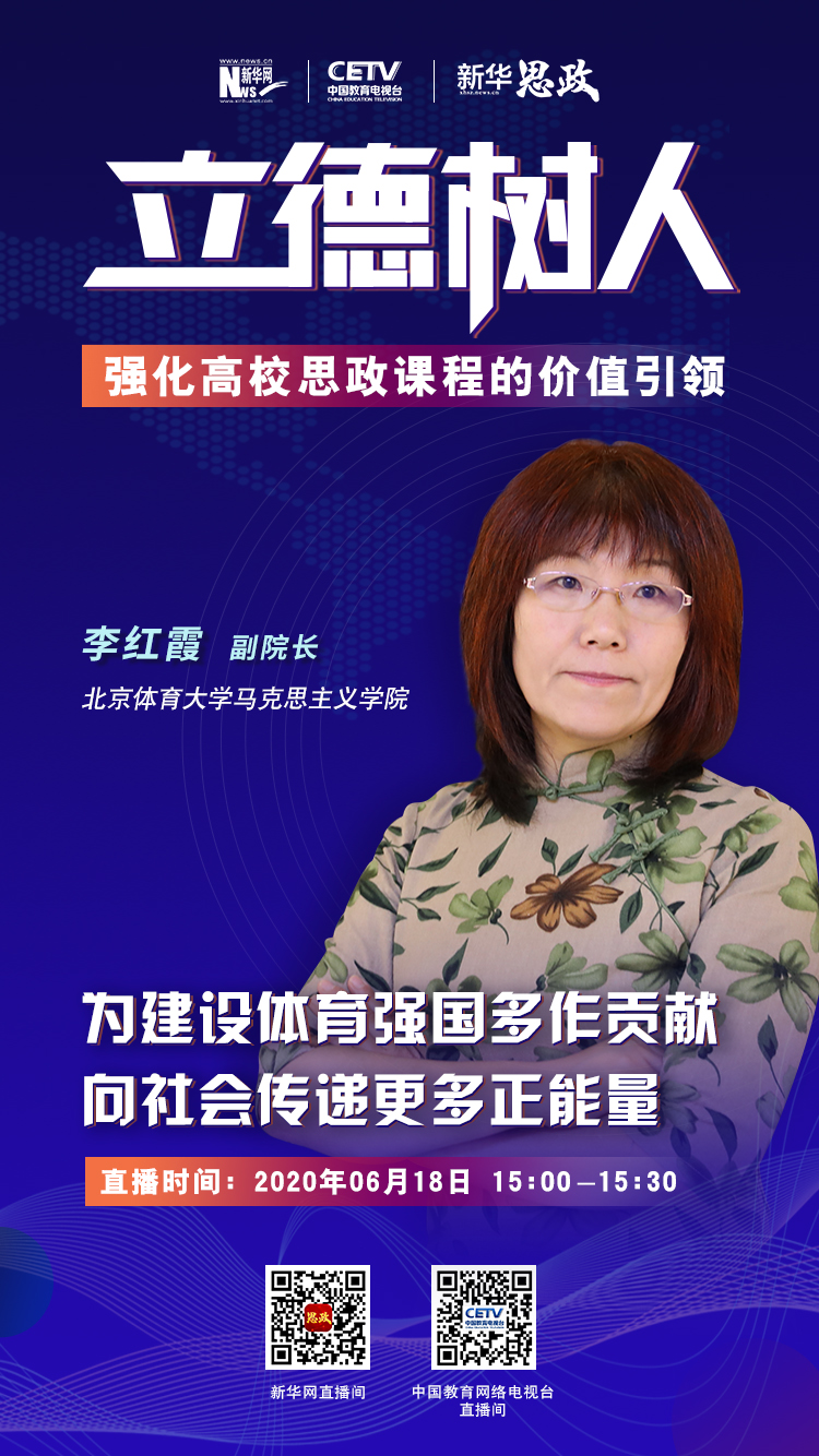 近日,由新华网和中国教育电视台联合推出 2020 年“新华思政”系列直播,围绕“立德树人 强化高校思政课程的价值引领”话题,在特殊时期助力高校思政教学工作。中国·必威(西汉姆联)官方网站-betwayspo李红霞教授应邀走进新华网直播课堂,作为该活动第五期主讲嘉宾,以“为建设体育强国多作贡献,为社会传递更多正能量”为主题,和大家一起重温总书记回信并进行了深入解读。本次“新华思政”直播活动由中国·必威(西汉姆联)官方网站-betwayspo联合教务处、北体传媒完成。直播当日吸引近54万人在线观看,受到了社会各界人士、在校师生的广泛好评。