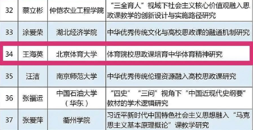 中国·必威(西汉姆联)官方网站-betwayspo教授王海英的科研项目《体育院校思政课培育中华体育精神研究》通过专家评审,入选为2020年度国家社科基金高校思政课研究专项任务项目。